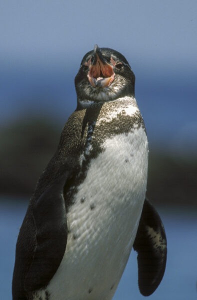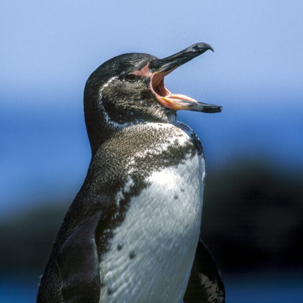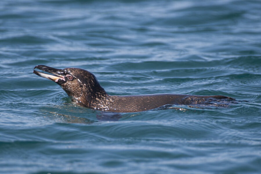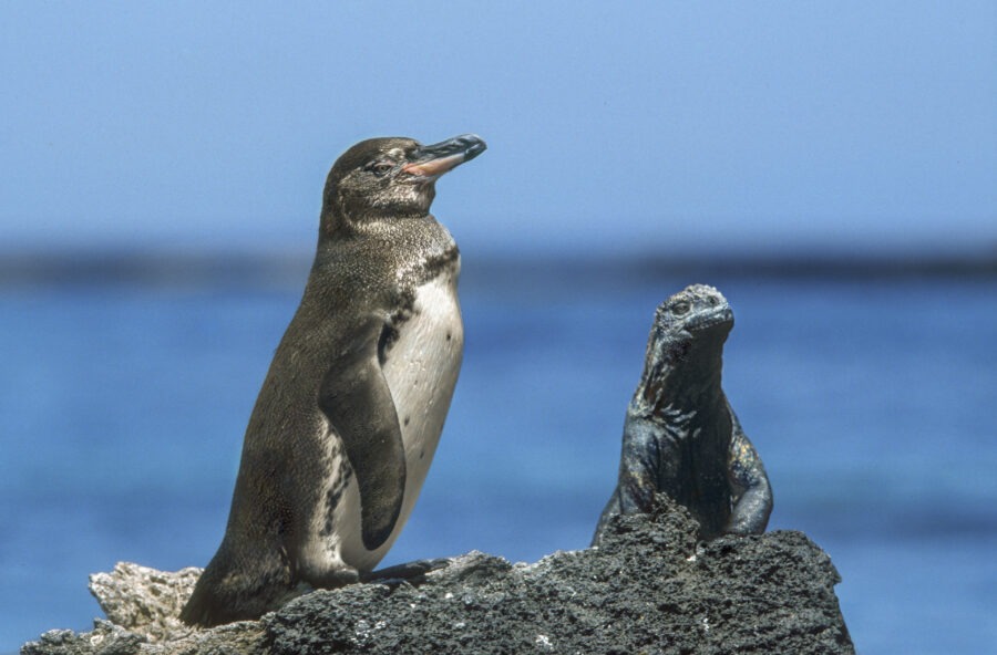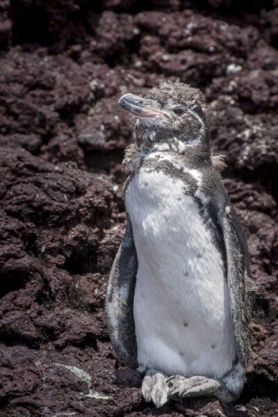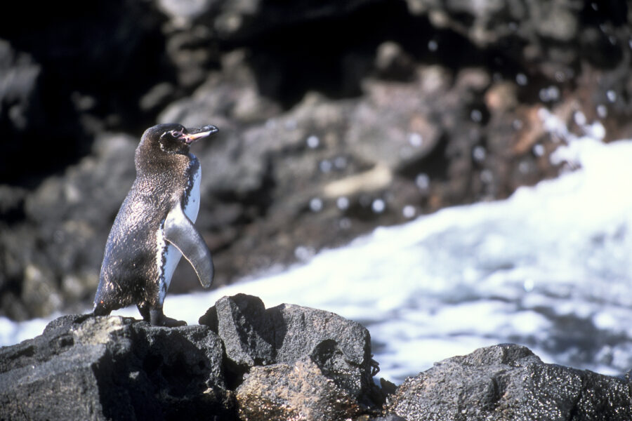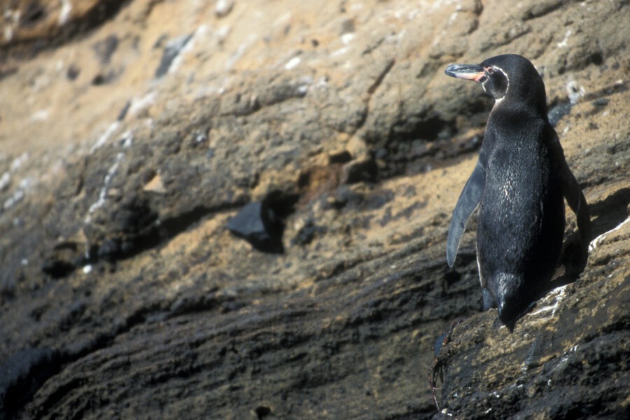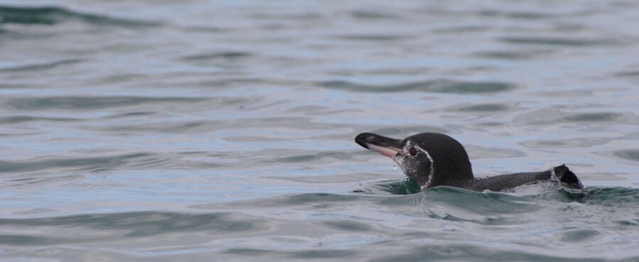 Le Manchot des Galapagos passe les journées dans l’eau et ne vient à terre que le soir quand la température est moins forte.