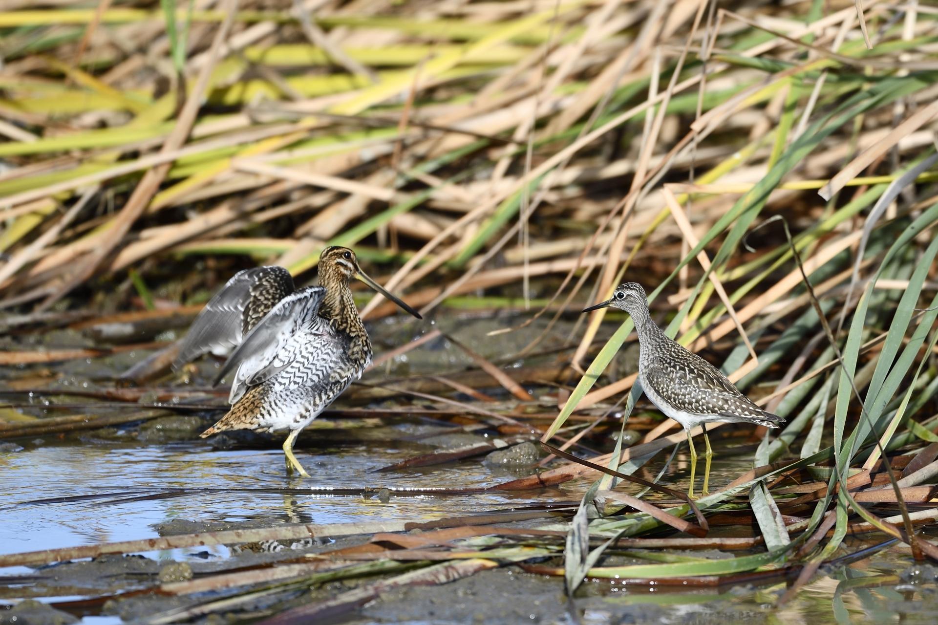 Bécassine des marais et chevalier sylvain , bon c’est eux qui ont choisi le fond bien encombré, mais j’ai trouvé la rencontre entre les deux intéressante