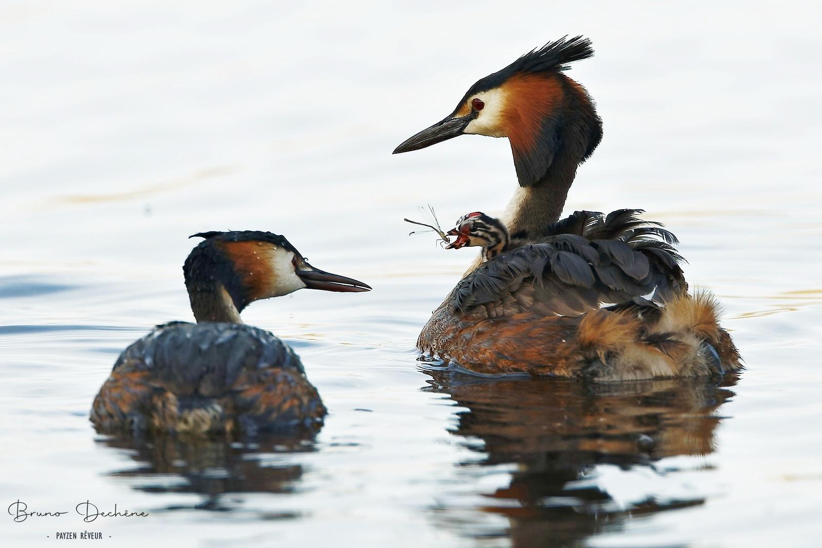 Avant de proposer de petits poissons à leur progéniture, papa et maman Grèbes Huppés offrent de petites libellules en guise de nourriture