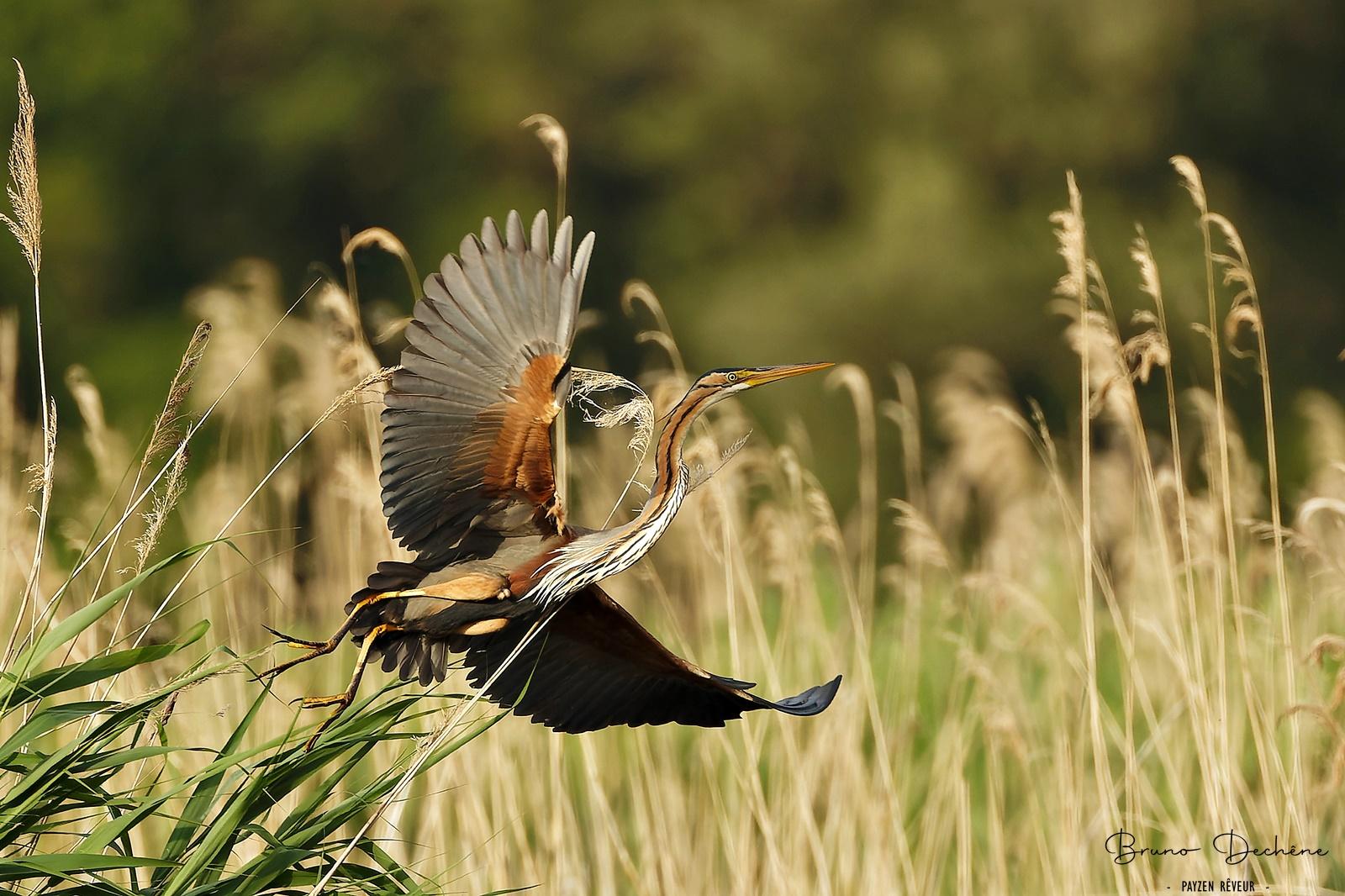Ce Héron pourpré était caché dans les roseaux depuis un bon moment, j’apercevais sa tête de temps en temps, il se décida enfin a décoller en déployant ses ailes colorées
