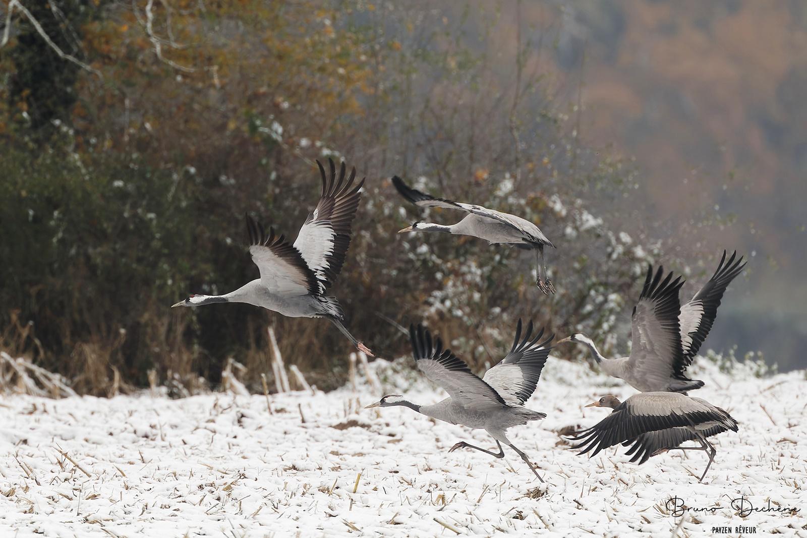 Souvenirs de Montier 2024… où j’ai capté depuis la route, ce groupe Grues décollant de ce champs enneigé…