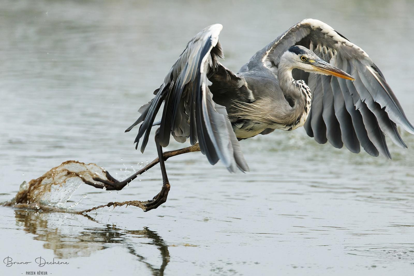 Prit sur l’instant, où ce Héron Cendré voulait voler dans les plumes d’une Aigrette Garzette, avec laquelle il ne voulait pas partager son garde-manger
