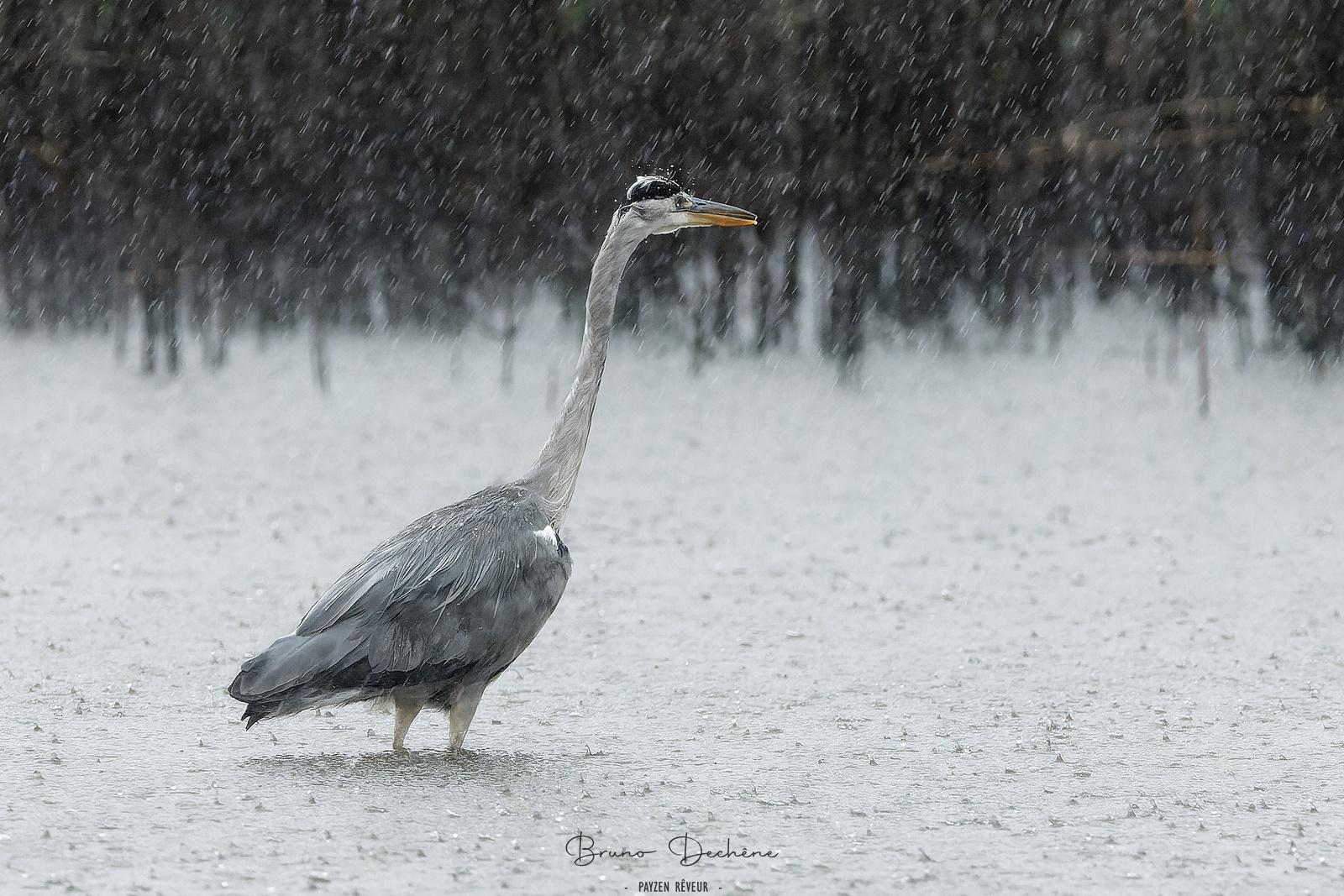 Matin pluvieux, Héron Cendré heureux… impassible sous cette averse, il est là, en approche discrète… j’avais choisi d’aller en Brenne par cette matinée qui était annoncée pluvieuse pour faire quelques clichés différents
