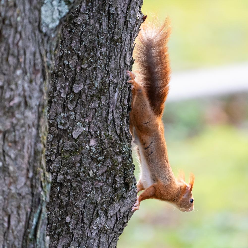 282 C’est la période des amours, et on peut observer 2 écureuils qui « jouent », mais sans de longues courses poursuites, juste des petits déplacement entrecoupés de postures immobiles à s’observer. Ici, l’autre est juste de l’autre coté du tronc