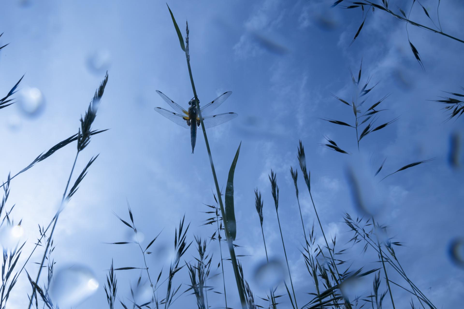 Libellule à 4 taches, 13 mai 2023, Ruy-Montceau, photo sous la pluie prise en contre-plongée avec un grand angle.