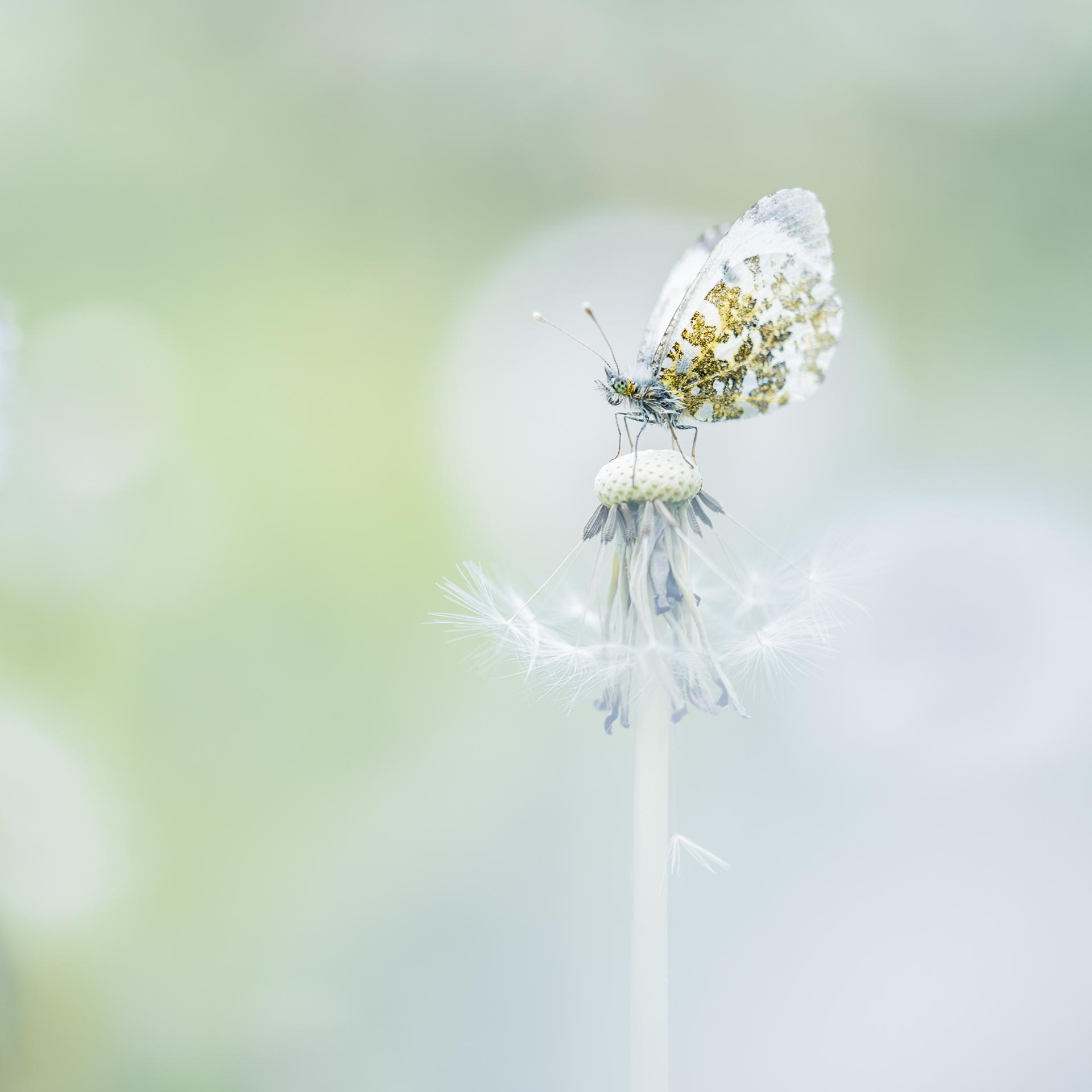 Aurore femelle dans un champ de pissenlits, 13 mai 2021, Somme, pris avec un pissenlit en premier plan.