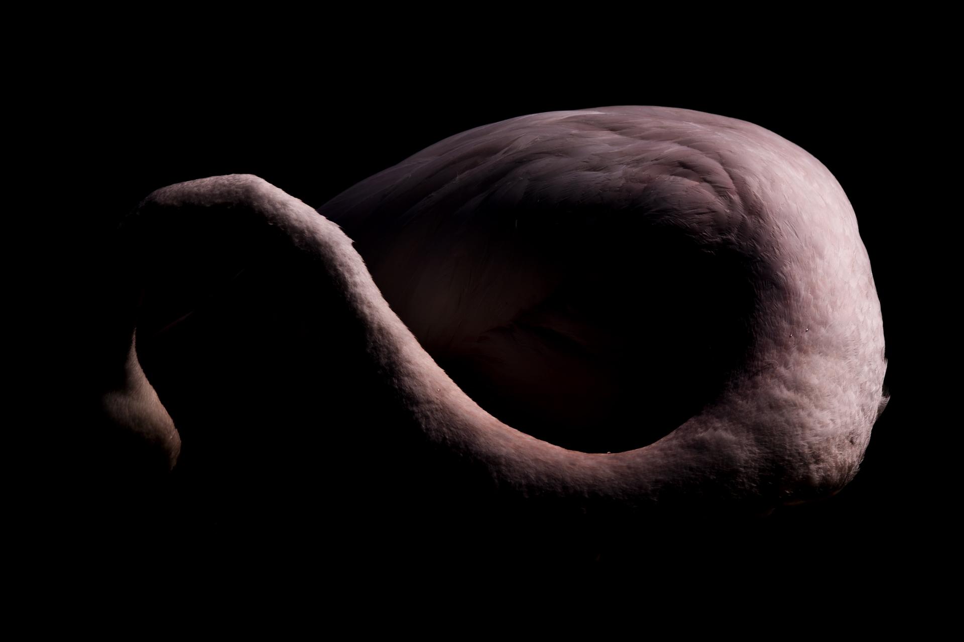 Flamant rose, 30 mai 2025, Parc ornithologique du Pont de Gau, forte sous-exposition d’un Flamant en train de se toiletter au soleil.