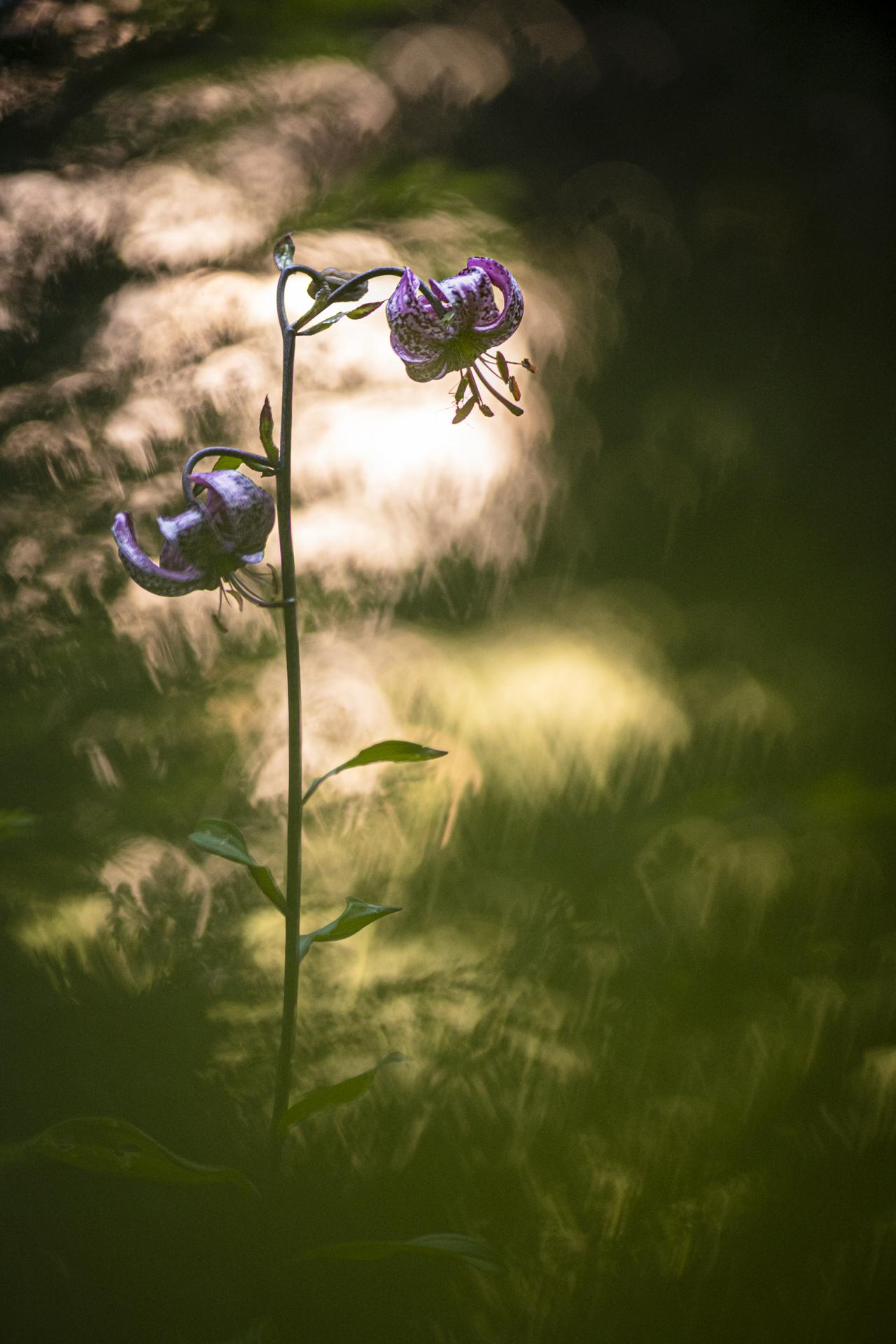 Lys martagon, 14 juillet 2024, Pralognan la Vanoise, feuille en premier plan et lever du soleil à travers les arbres en arrière plan.