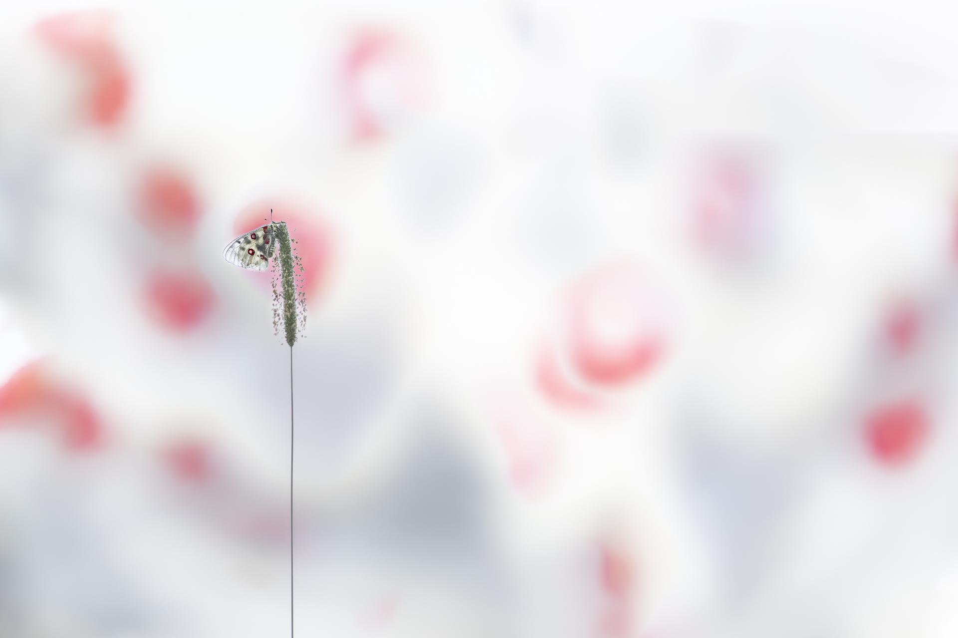 Apollon, 2 août 2024, Pralognan la Vanoise, pris le matin avant son envol. Surimpression: une première photo du papillon en high-key sur fond de ciel, puis 4 images en gros plan de l’aile de l’Apollon pour l’arrière plan.