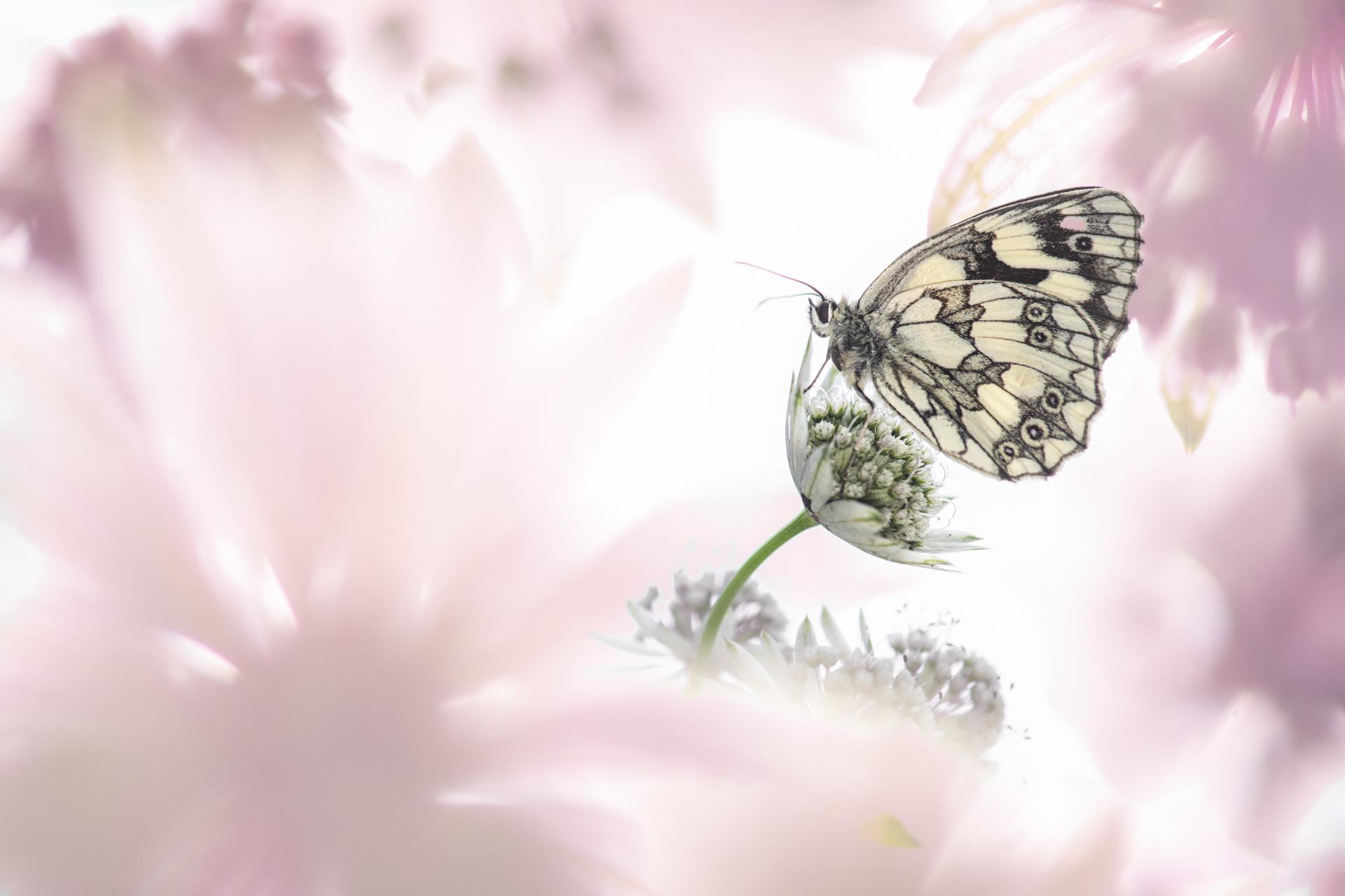 Demi-deuil sur une Grande astrance, 15 juillet 2025, Pralognan la Vanoise, surimpression: une première photo du papillon en high-key sur fond de ciel, puis gros 4 plans de Grandes astrances pour le fond.