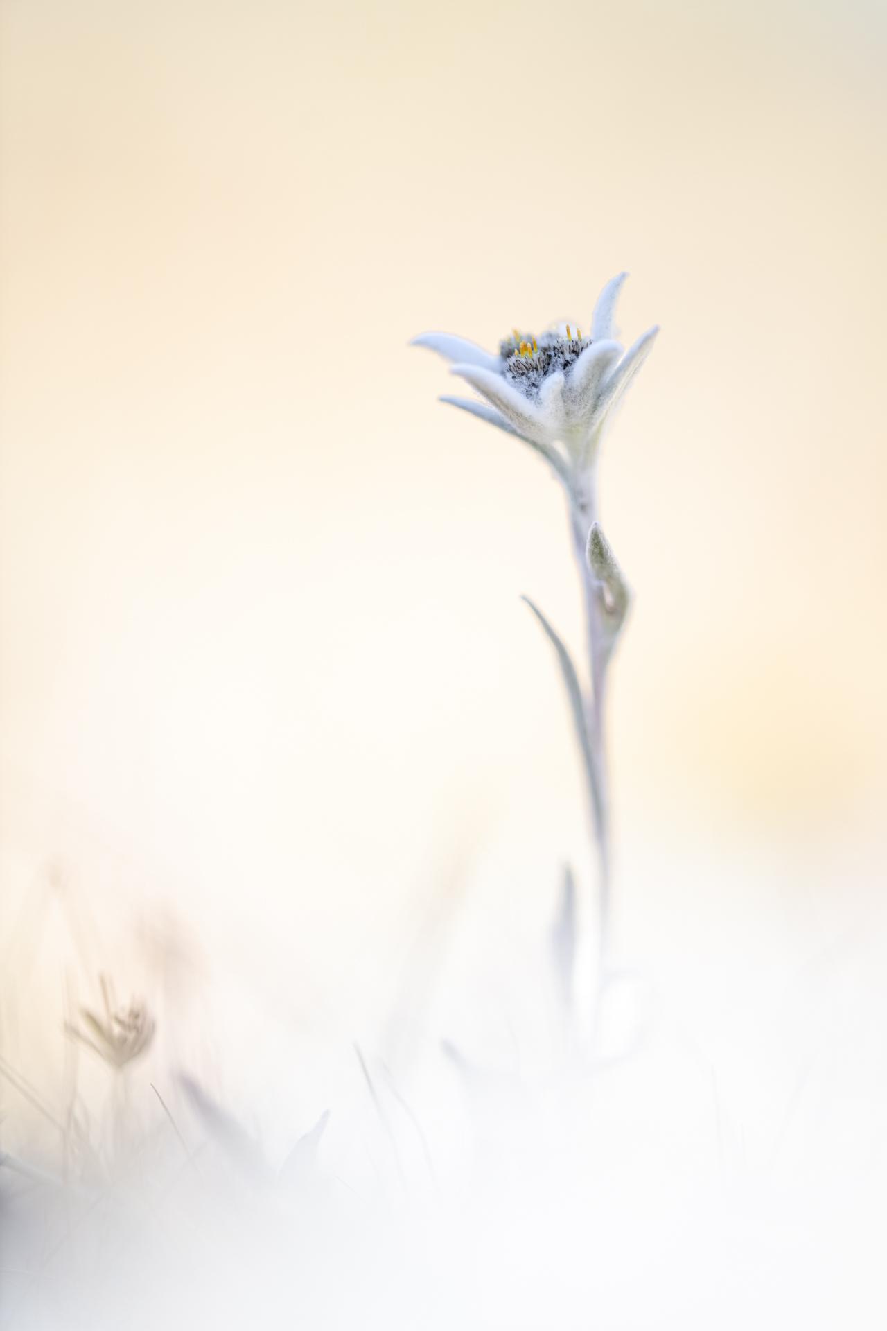 Edelweiss, 2 août 2022, Pralognan la Vanoise, mise à l’ombre avec l’arrière plan d’herbe sèche au soleil, caillou en premier plan.