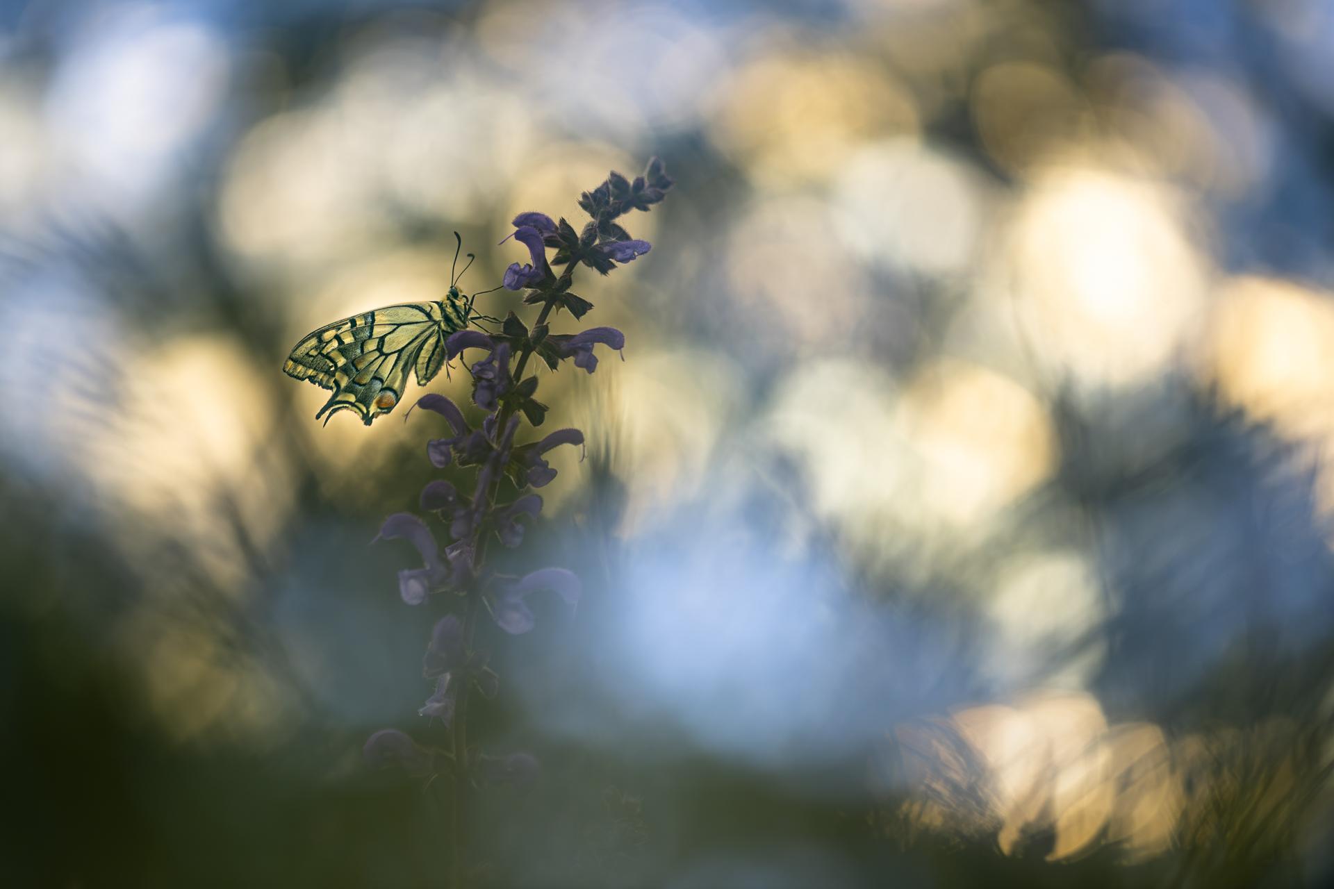 Machaon posé le soir, 13 mai 2023, Ruy-Montceau, surimpression: première image avec le machaon en contre-jour avec une balance des blancs chaude, puis deuxième image de bokeh avec une balance des blancs froide.