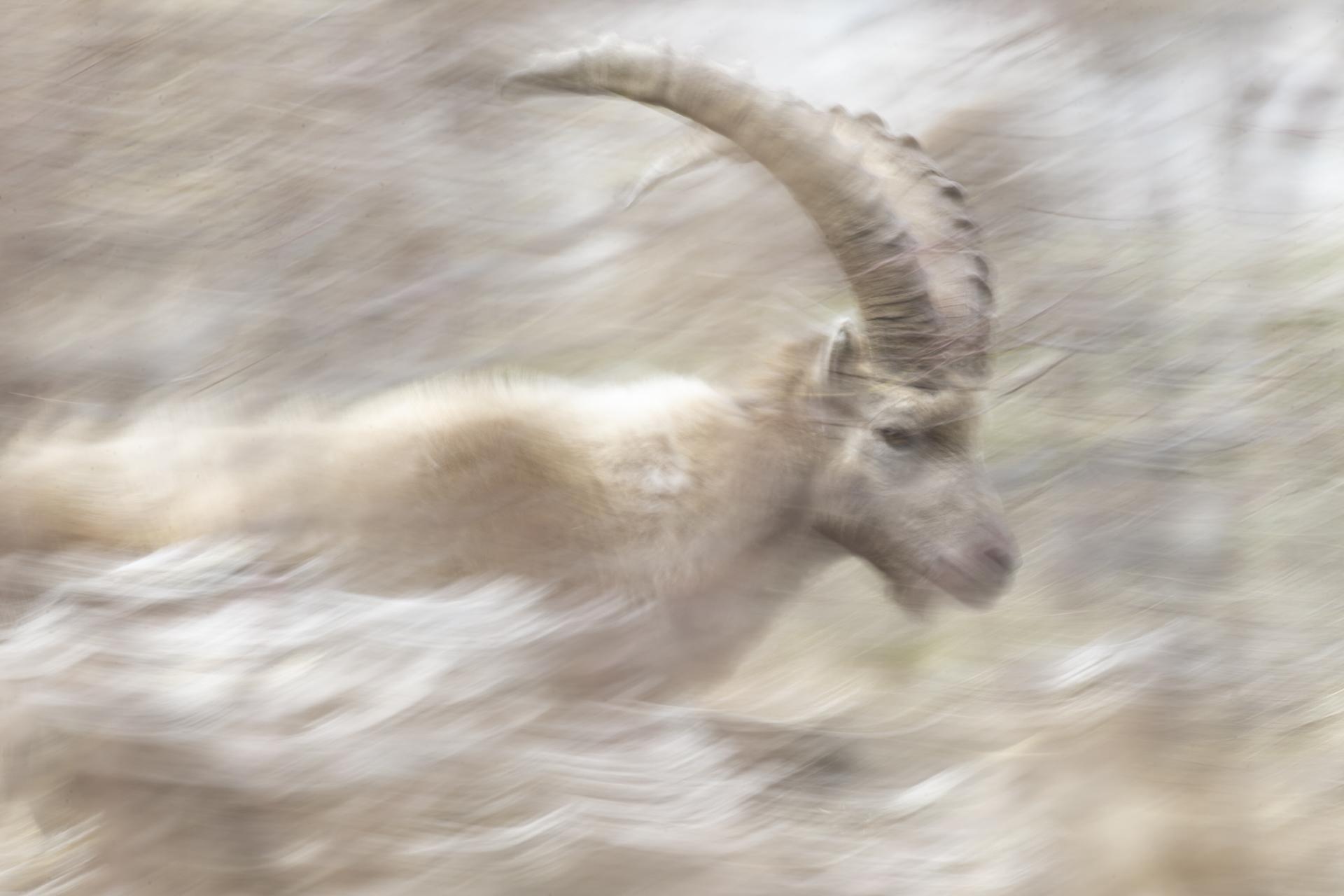 Bouquetin des Alpes, 15 avril 2025, Champagny en Vanoise, le groupe de bouquetins est redescendu pour brouter l’herbe libérée de la neige. Pose lente en filé d’un Bouquetin.