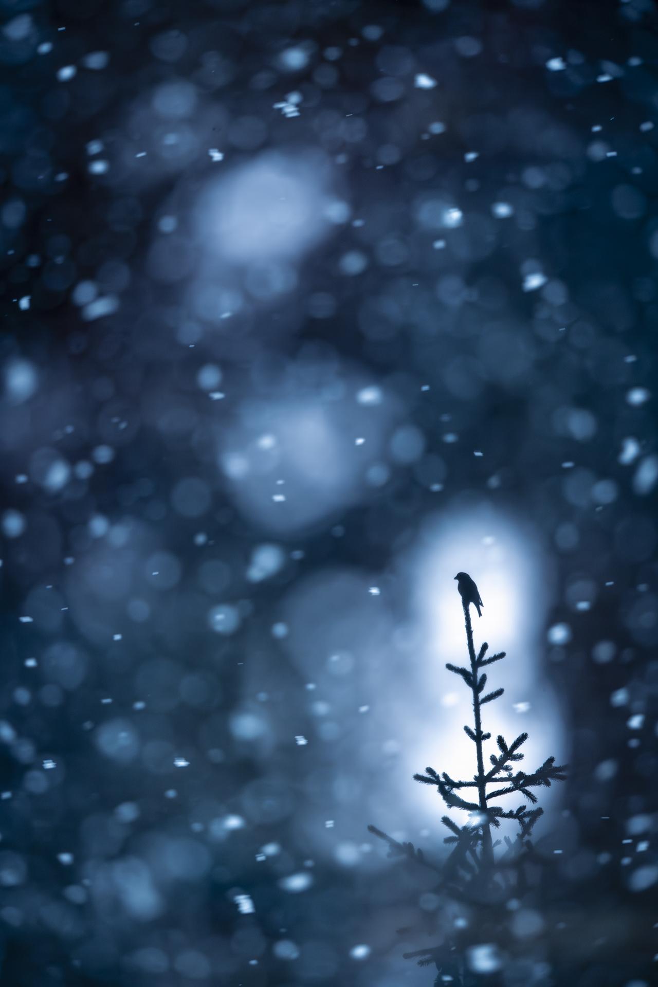 Bec-croisé des sapins, 5 mars 2024, Pralognan la Vanoise, surimpression: première image avec le Bec-croisé à travers une trouée, puis seconde image avec la neige en train de tomber sur fond sombre.