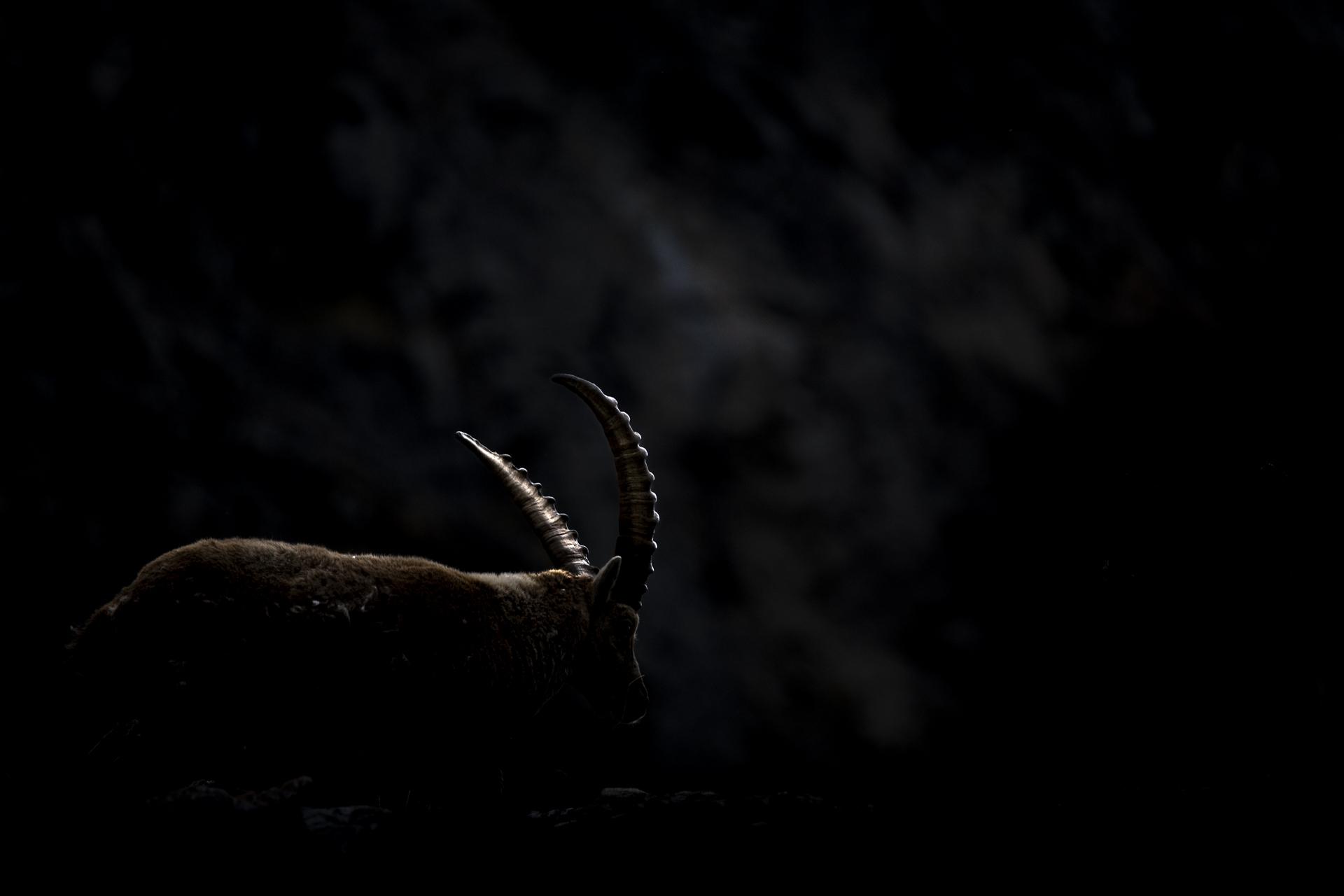 Bouquetin des Alpes, 28 avril 2024, Champagny en Vanoise, le groupe de bouquetins est redescendu pour brouter l’herbe libérée de la neige. Grosse sous-exposition, devant un pan de roche sombre.