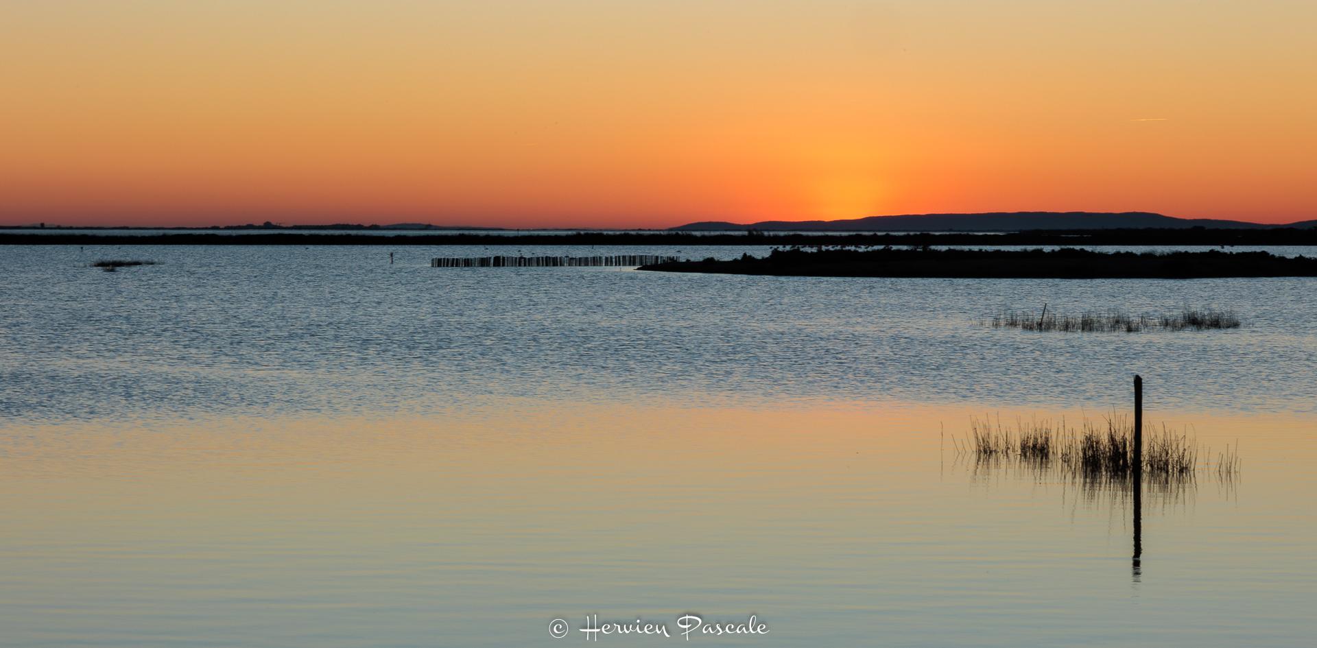 Bernard, oui, le Pouillot est un peu petit mais c’est un choix délibéré pour ne pas perdre trop de qualité. Il a été photographié avec le R6 avec le coéf. 1.6 qui ne fait plus que 7 millions de pixels environ. J’ai donc fait le choix du cadrage carré sans recadrer d’avantage sur l’oiseau.Je continue cette 3ème journée. L’après-midi après un déjeuner pris avec Karine et Damien, Maggy et moi avons changé de décor pour nous rendre dans l’Hérault. Nous y avons fait le coucher de soleil sur l’Etang de l’Or.