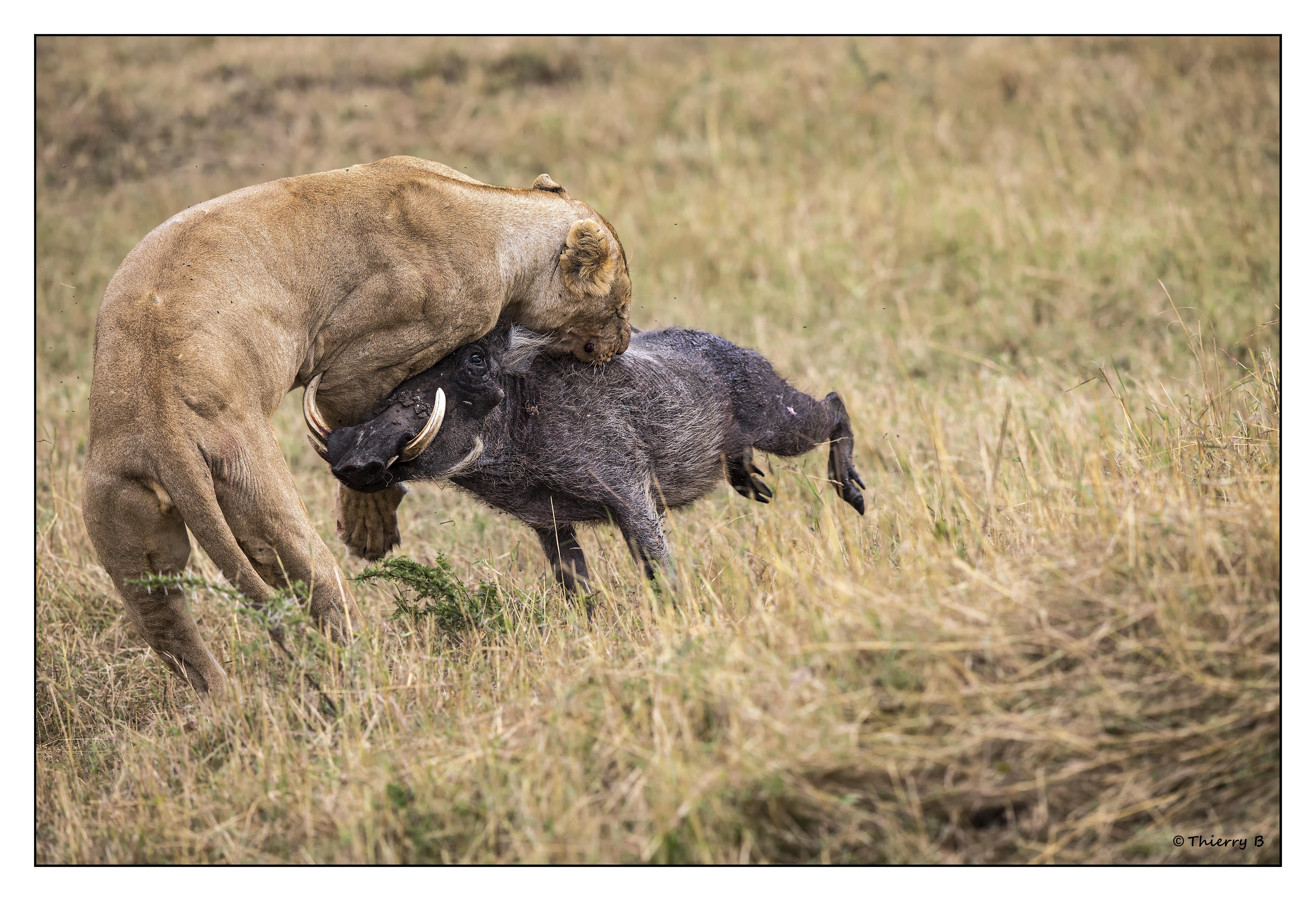 29 février 2020 à 11 h 41 min #15854Dans les contrées lointaines, le continent Africain revêt un caractère particulier pour un photographe animalier. Ici, un long combat commence entre une lionne et un beau phacochère mâle. Photo prise au Kenya