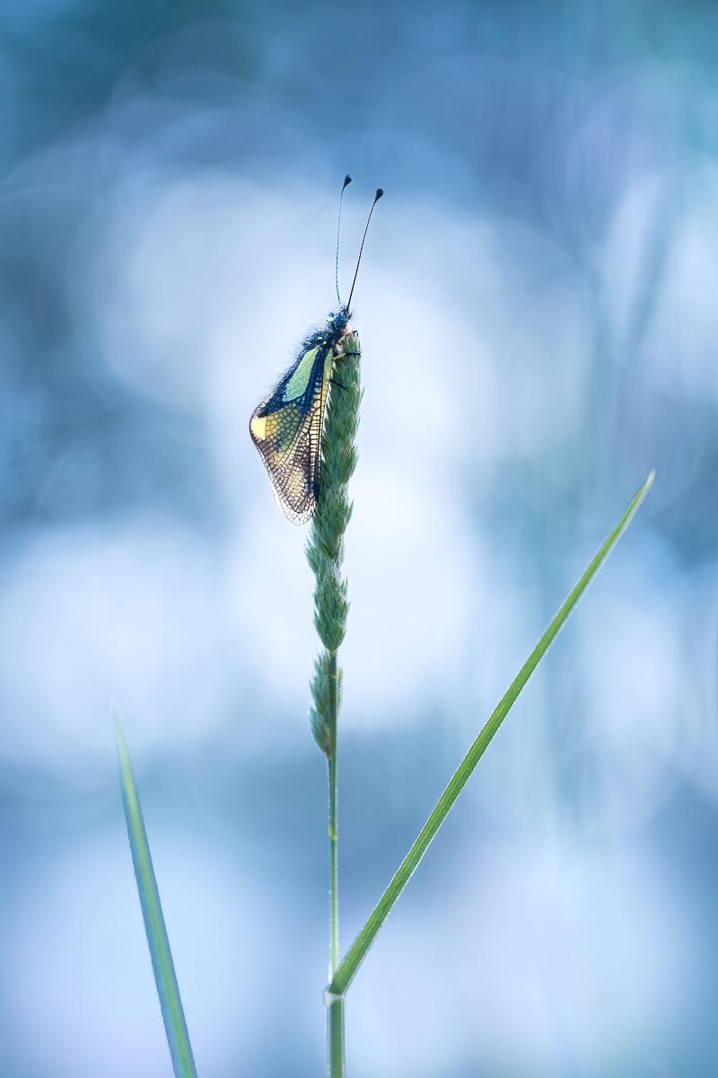 3/ Mon sujet favori en macro : l’ascalaphe soufré (libelloides coccajus) couvert de rosée matinale.