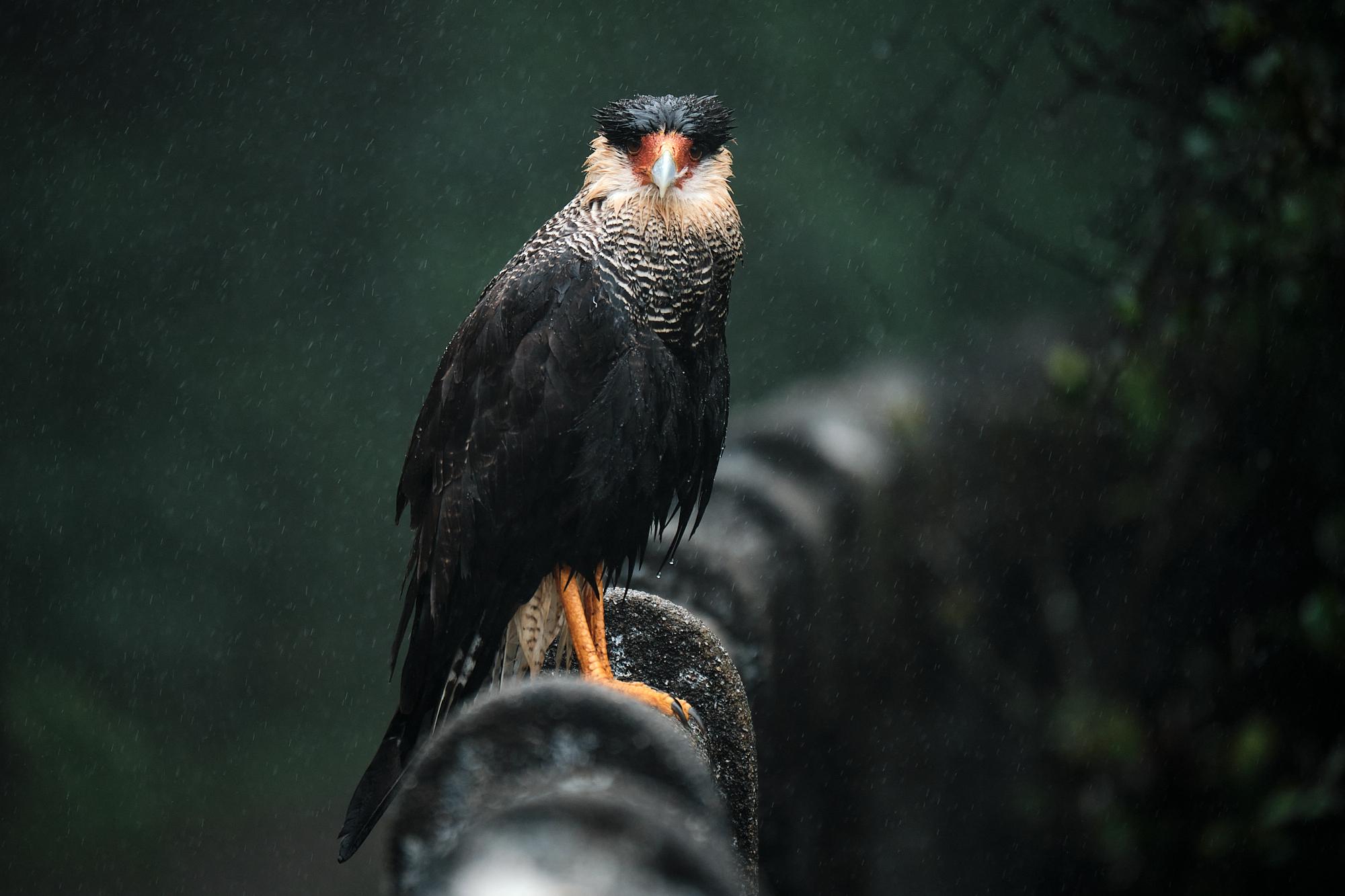 Un caracara Huppé perché sur un pont, sous la pluie. Itatiaia, Brésil.