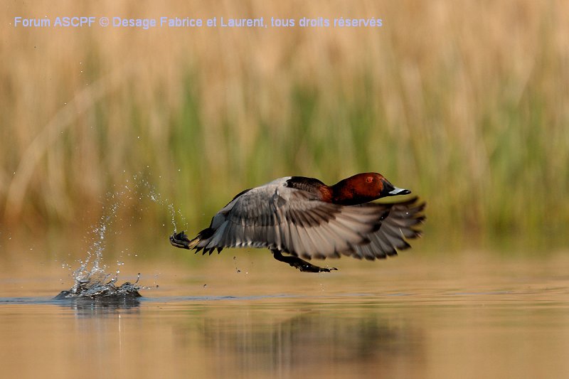 Plus facile à saisir, l’envol de ce fuligule milouin, puisque l’oiseau, en prenant son élan à l’envol, n’est pas encore trop rapide. Il est utile de repérer un oiseau s’apprêtant à s’envoler. Vous remarquerez que l’oiseau hoche la tête par saccades souvent, juste avant de s’élancer. Tenez vous prêt. Si c’est un canard plongeur, comme le sont le milouin et le morillon, il commencera par une course d’élan , qui est en plus très photogénique quand l’eau gicle sous ses coups de pattes.